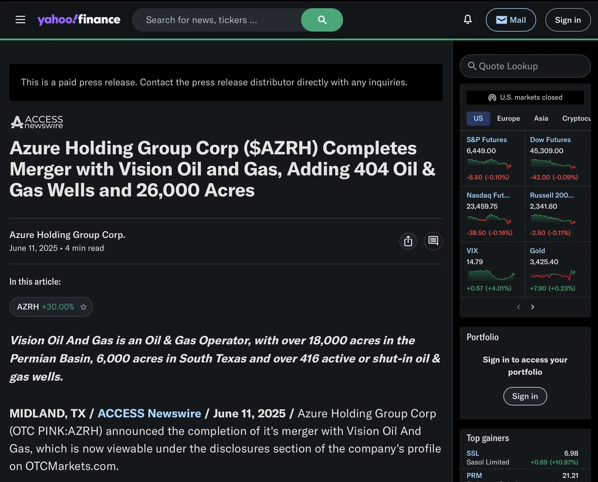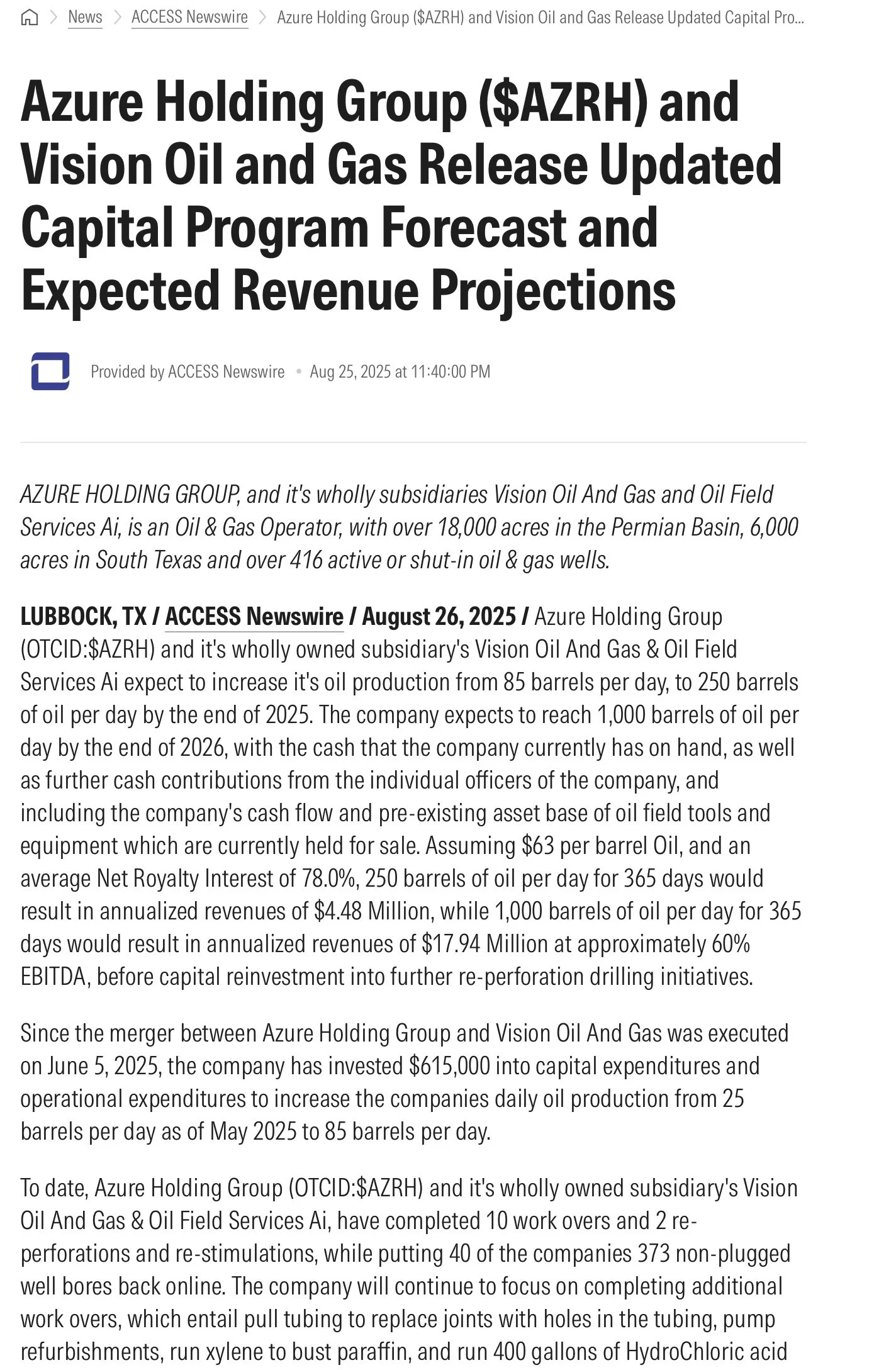 As a result of the Merger, Azure Holding Group will be renamed Vision Oil And Gas. The merger brings with it 102 actively producing oil & gas wells, 241 shut-in wells (of which at least 120 have been identified as a workover candidate), and 42 injection wells spread primarily across 18,300 Acres on Tier 3 acreage in Cochran County in the Permian Basin. The merger also brings an additional 31 wells in South Texas located across 6,000 acres in Nueces, Duval, Bee, Webb, Starr and Zapata Counties in South Texas.