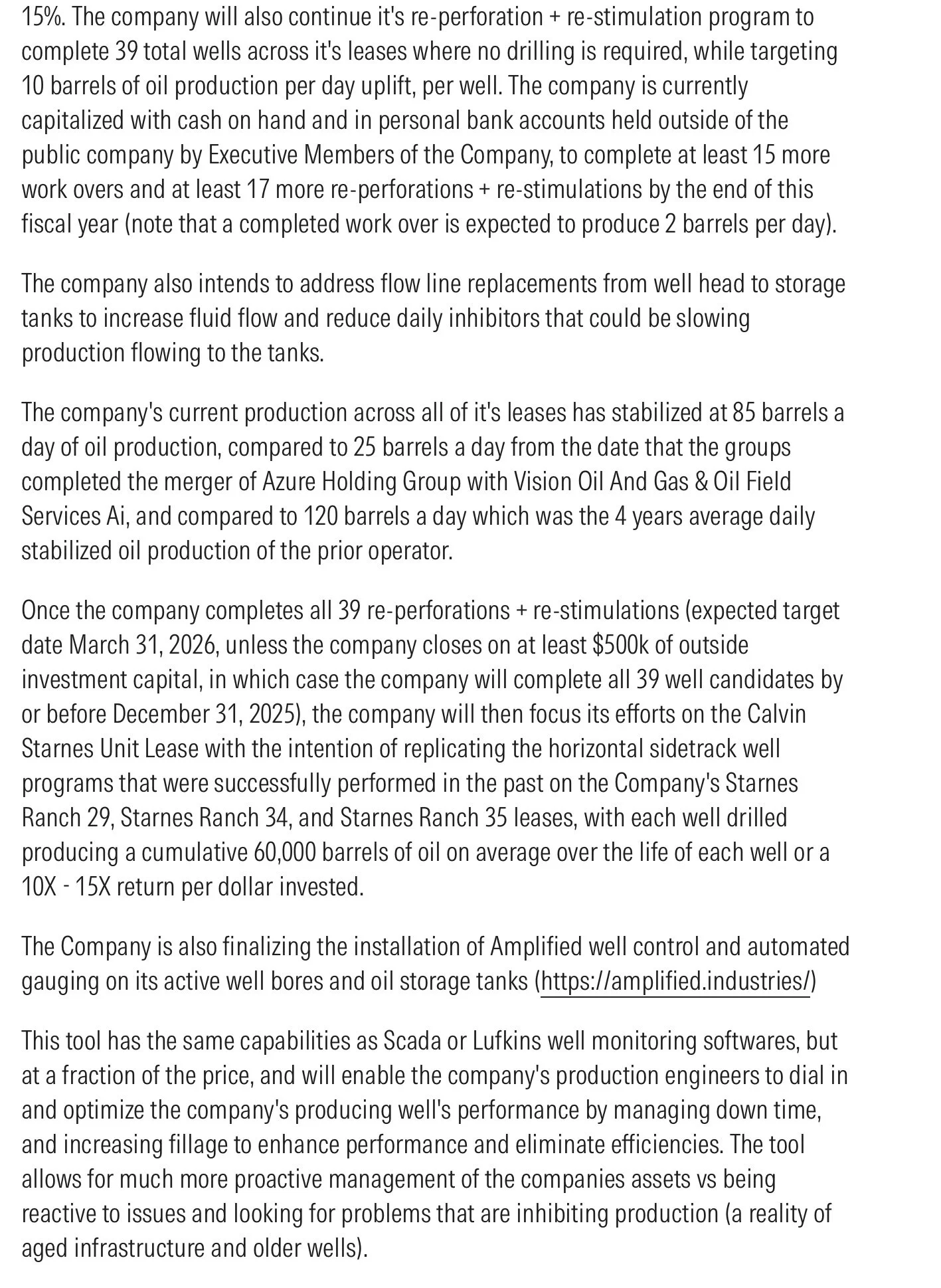 The group believes that it will achieve between 200 to 250 barrels a day of production through it's first phase of remediation by December 2025, focusing on recovery efforts in the San Andreas formation where the wells are currently producing at depths varying between 5,000 and 5,000 feet. The company also intends to complete it's remediation efforts across it's South Texas assets by December 2025, adding between 50 to 80 BOED in production.